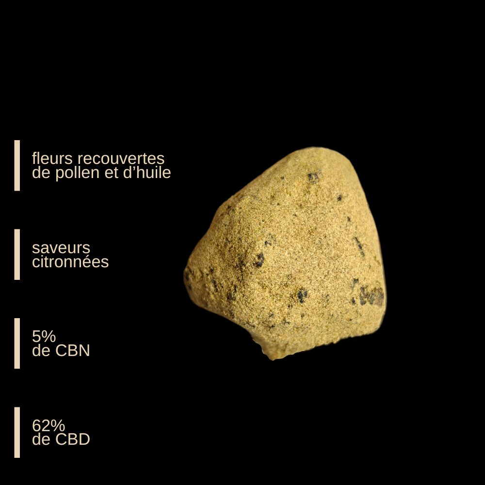 • La Moon Rock est une tête de fleur trempée dans de la wax ensuite plongée dans du pollen de CBD, ce qui amène un taux élevé en CBD.